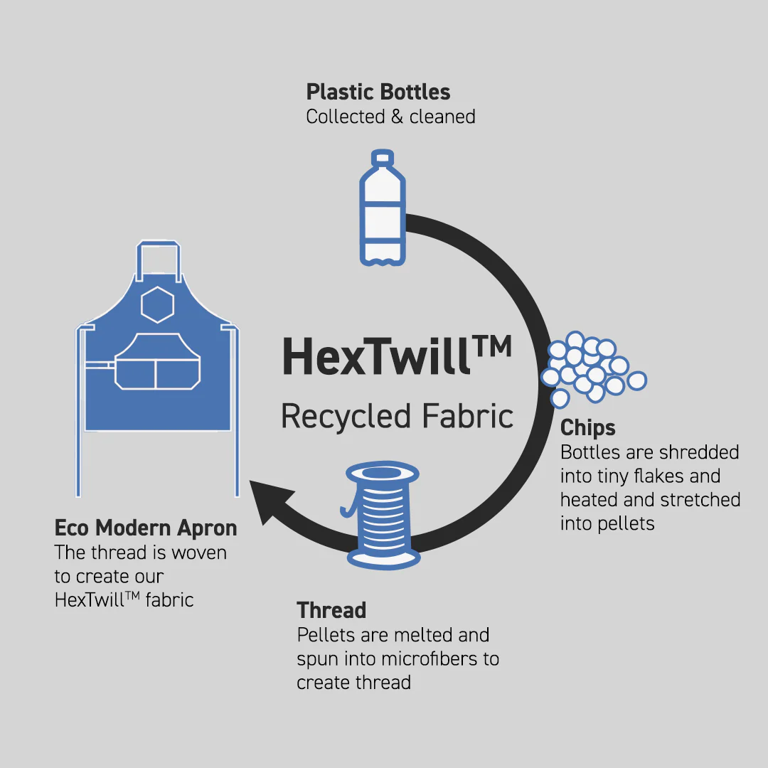 - Each apron body is made out of HexTwill™ recycled fabric, 100% rPET (recycled polyethylene terephthalate), keeping plastic bottles out of landfills.